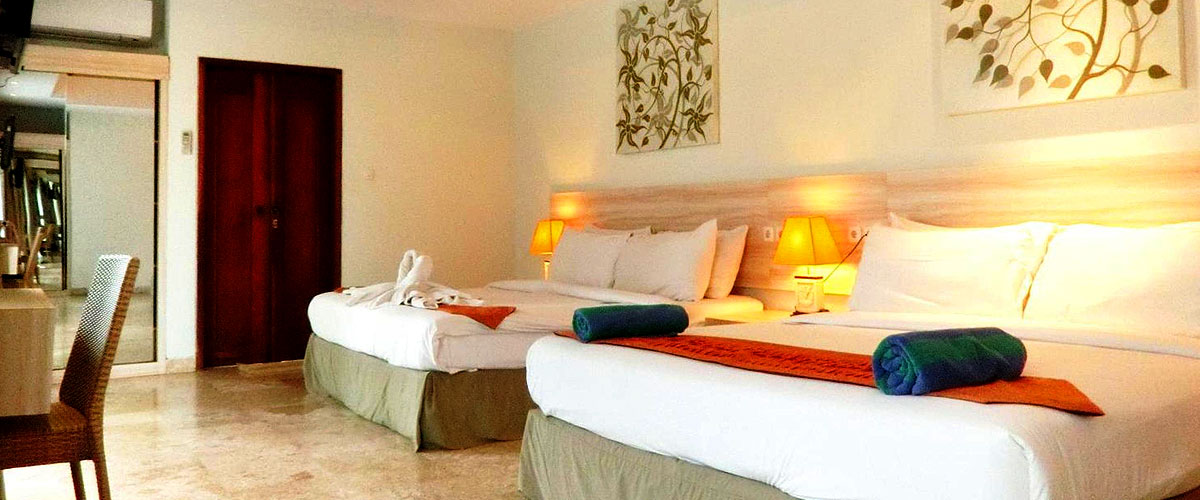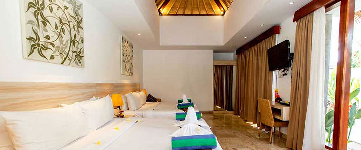 The bedroom is fitted with two large beds, a wardrobe, flat-screen cable TV, DVD player, personal safe and an en suite bathroom featuring bath and shower facilities, hairdryer, and free toiletries.