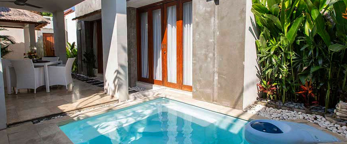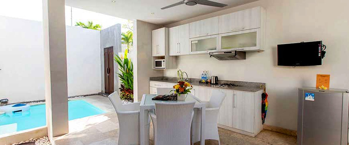 This spacious and air-conditioned one-bedroom suite boasts a private outdoor pool, separate dining area with a fully-equipped kitchenette.